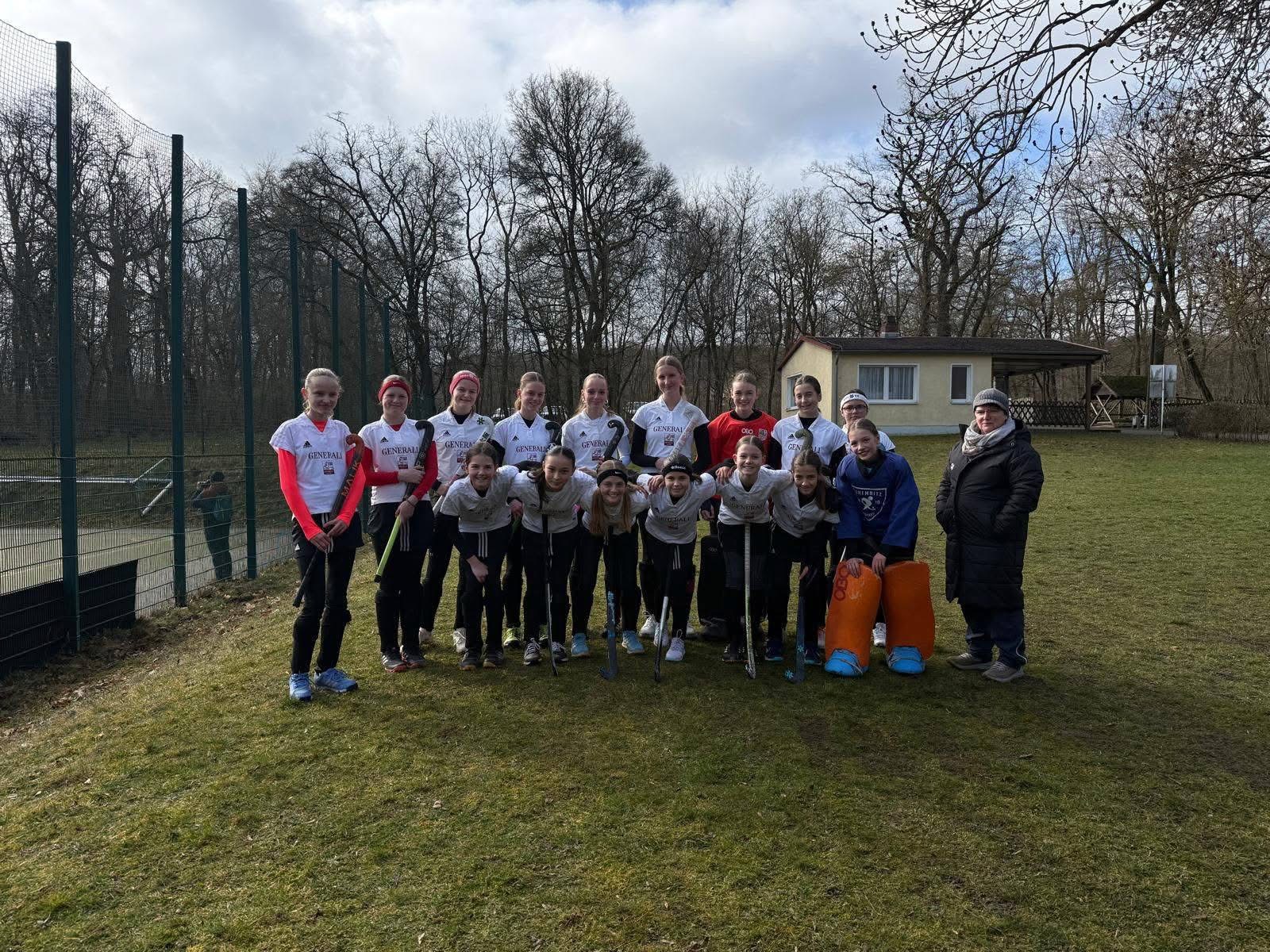 Doch Celine aus der weiblichen U14 des FHTC startete bereits am ersten Aprilwochenende in die Vollen. Die 13-Jährige war für die U14 des Sächsischen Hockeyverbandes nominiert und streifte sich noch vor dem Osterferien erstmals das weiße Trikot der sächsischen Landesauswahl über - und zwar im thüringischem Sondershausener Ortsteil Straußberg. Vor den Augen von Landesauswahltrainerin Ulrike Sluga feierte die Stürmerin Premiere auf überregionaler Ebene. Auch der Freiberger Joel lief bereits zum ersten Mal in der männlichen Auswahl auf. „Das hat hier mit den Mädels schon richtig Spaß gemacht“, berichtete Celine. Zusammen mit den Spielerinnen der anderen sächsischen Vereine übernachtete die Freibergerin nicht nur vor Ort, sondern griff bei dem zweitägigen Lehrgang im Rahmen des Straußberg-Cups mit Spielen gegen die Landesauswahlteams Brandenburgs, Thüringens, Sachsen-Anhalts, Bremens und Niedersachsens zum Feldhockeyschläger. In der Endabrechnung lief die sächsische Mädchen-Auswahl nach Siegen gegen Brandenburg (1:0), Sachsen-Anhalt (2:0), Thüringen (1:0), Unentschieden (0:0) gegen Bremen und der 0:3 Niederlage gegen Sieger Niedersachsen auf Platz zwei ein. Die Jugendauswahl schloss den Wettbewerb auf Rang drei ab. „Es war spannend in einem komplett neuen Team aufzulaufen, die Position im Sturm kannte ich allerdings schon.“ Und auch wenn es noch keinen Treffer für die Freiberger heraussprang, fiel ihr Fazit positiv aus. „Die Trainerin hat uns tolles Feedback gegeben, das motiviert für die nächste Zeit. Ich will natürlich Gas geben und mich wieder empfehlen.“ Der Straußberg-Cup gilt als erste Bewährungsprobe für die sächsischen Talente in einer mehrstufigen Sichtung. In der WU16 geht es bestenfalls in den Länderpokalen „Hessenschild“ und „Berlinpokal“ weiter, dort wird auch für die DHB-Auswahl gesichtet. Bis dahin kann sich Celina weiter empfehlen und läuft mit der Weiblichen U14 in der Mitteldeutschen Meisterschaft auf. #hockey#freibergerhtc #fhtc #jugendhockey#sogehtsaechsisch Fotos: Sebastian Strauß, Tobias Seifert